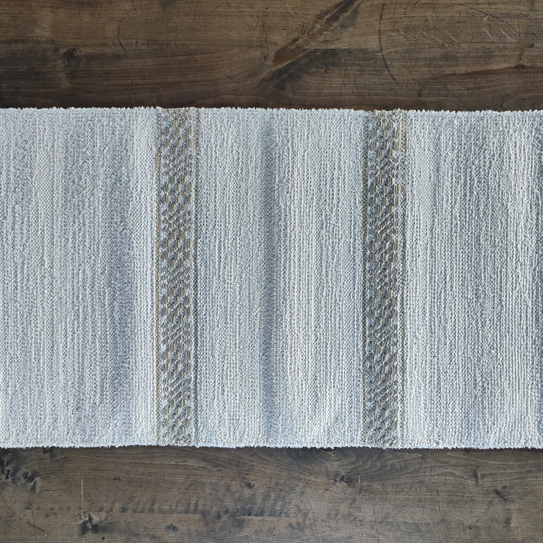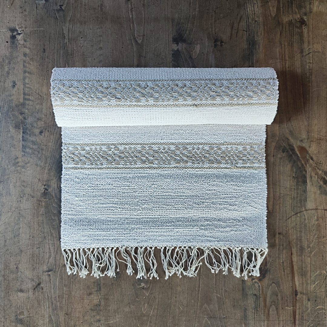 Tämä poppanaliina on valmistettu Suomessa käsin kangaspuilla kutoen.